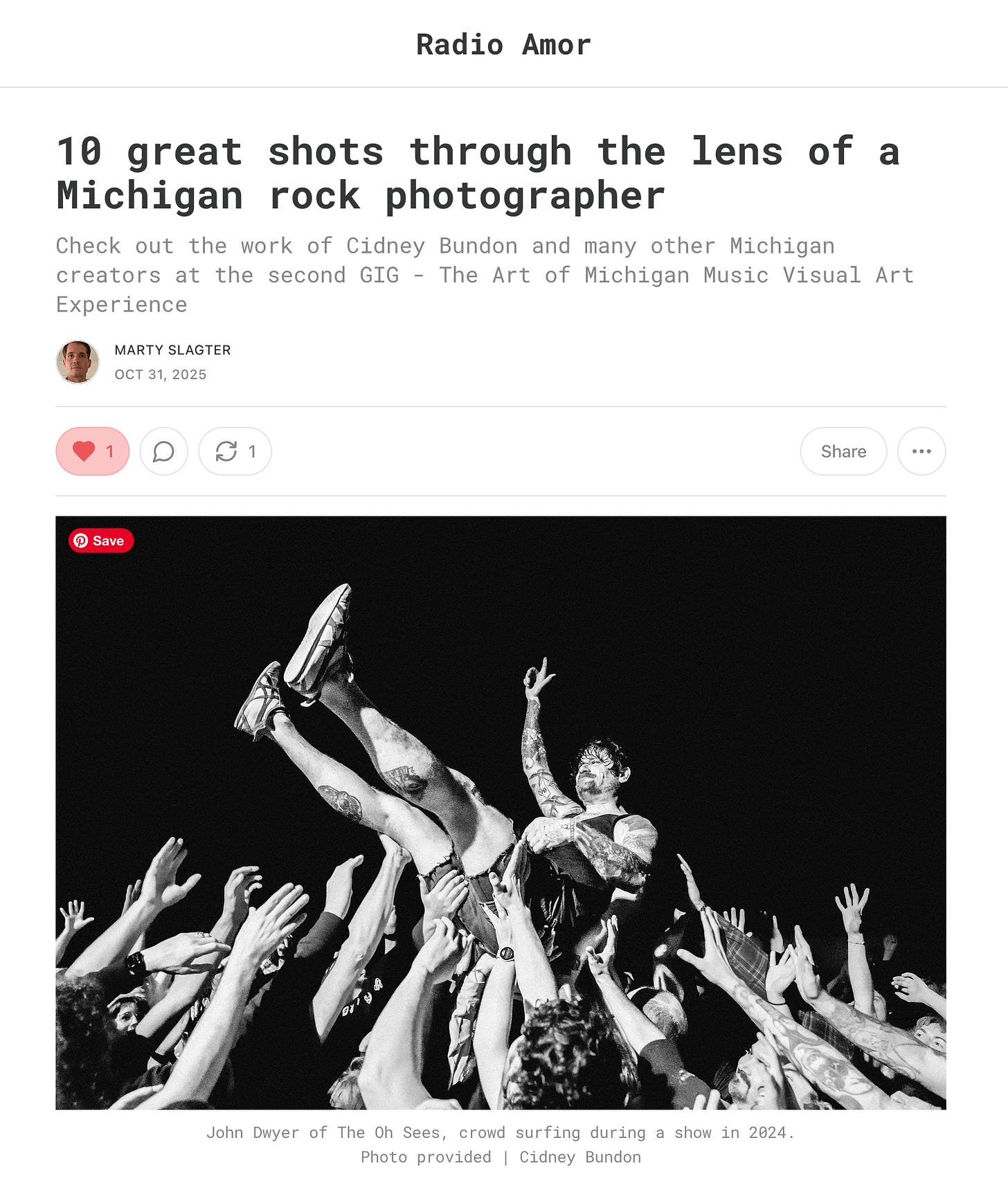 Marty Slagter at Radio Amor wrote an excellent profile on visual artist Cidney Bundon from Detroit. The photographs are fabulous, and Cidney shares insights on the photos. When you come out to GIG 2025, be sure to check out some of Cidney’s imagery in the art exhibit.