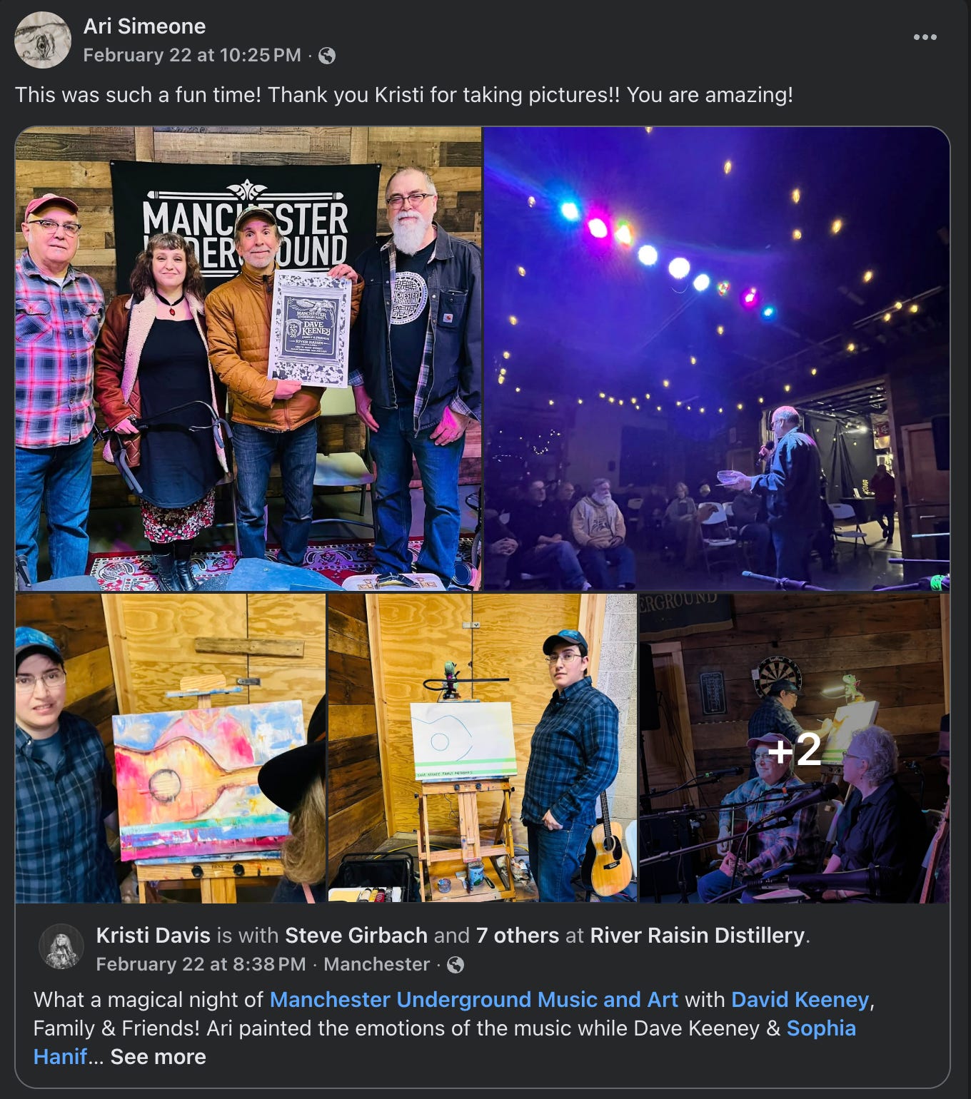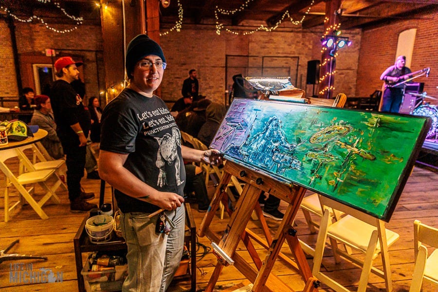 If you want to experience Ari’s artwork, stop by their studio at ART 634 in Jackson. Or come out to a Manchester Underground concert at the River Raisin Distillery, where they will be doing live painting at each upcoming show.