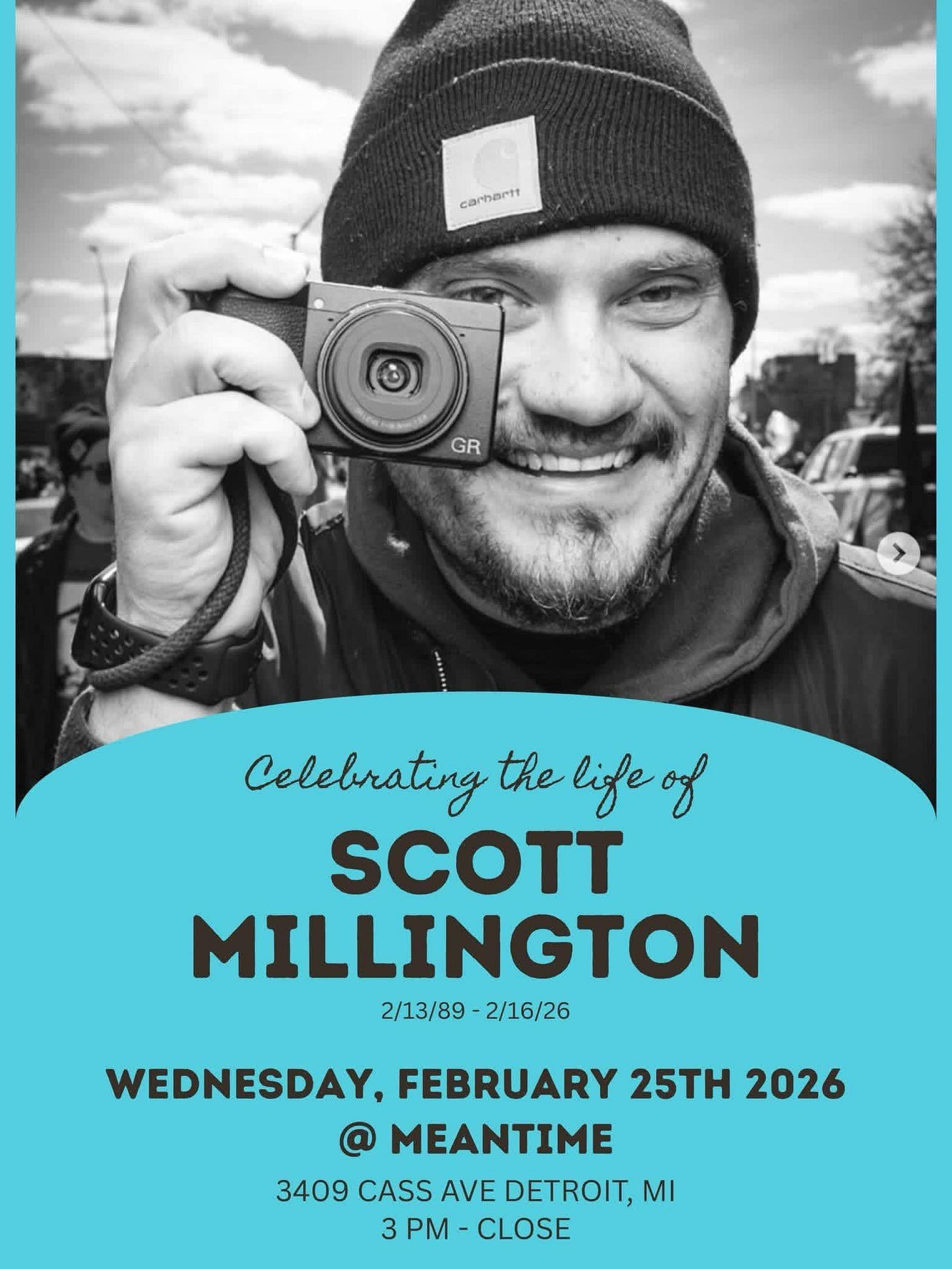 His family and friends are celebrating his life on Wednesday, February Feb 25th, starting at 3 pm at Meantime (3409 Cass Ave, Detroit). In lieu of flowers, donations can be made to Six Feet Over in Scott’s name using this link: